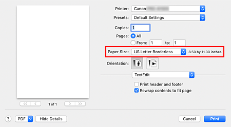 Seleccione "XXX Sin bordes" en Tamaño de papel (Paper Size) en el cuadro de diálogo de impresión.