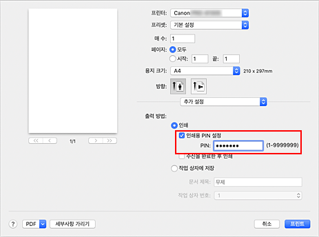인쇄용 PIN 설정(Set PIN for printing) 옆의 확인란을 선택하고 PIN에 1~7자리 숫자를 입력합니다.