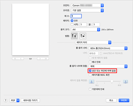 롤 용지에 인쇄하는 경우 상단 및 하단 여백을 줄여 용지를 절약할 수 있습니다.