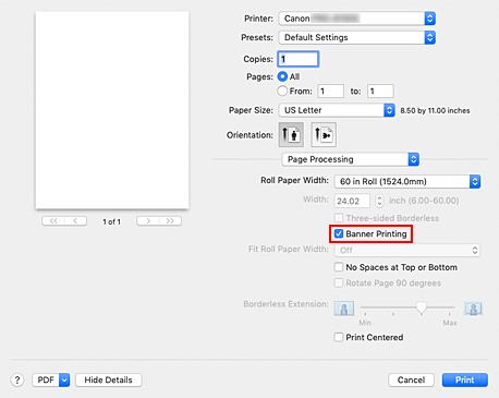 Marque a caixa de seleção Impressão de banner (Banner Printing).