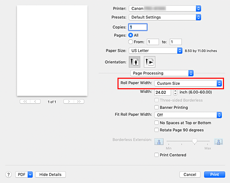Selecione Tam. pers. (Custom Size) para Larg. papel em rolo (Roll Paper Width).