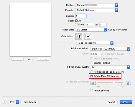 - Ao selecionar papel no formato retrato em Tamanho do papel (Paper Size) na caixa de diálogo de impressão, quando ele exceder a largura selecionada em Larg. papel em rolo (Roll Paper Width), Girar a página em 90 graus (Rotate Page 90 degrees) não poderá ser usado.