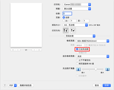 如果使用三边无边距打印功能,则可以合并与卷纸宽度不匹配的纸张尺寸,并在三边执行无边距打印。 但是,如果执行三边无边距打印,则需要在打印后裁切纸张的右侧。