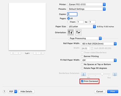 - When you select "XXX Borderless" from Paper Size in the print dialog, the Print Centered is grayed out and cannot be selected.