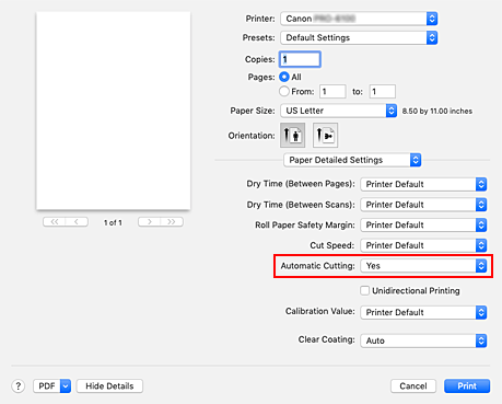 Note- The default setting for automatic cutting is Yes.