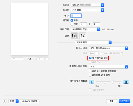 프린트 대화 상자의 용지 크기(Paper Size)에서 "XXX 테두리 없음"을 선택합니다.