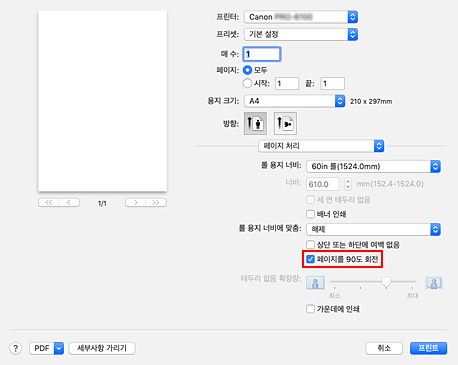 • 프린트 대화 상자의 용지 크기(Paper Size)에서 세로형 용지를 선택한 경우 그 길이가 롤 용지 너비(Roll Paper Width)에서 선택한 너비를 초과하면 페이지를 90도 회전(Rotate Page 90 degrees)을 사용할 수 없습니다.