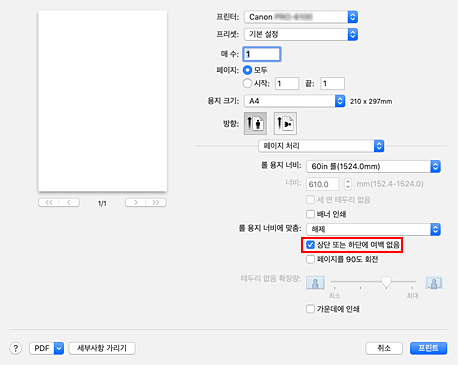 롤 용지에 인쇄하는 경우 상단 및 하단 여백을 줄여 용지를 절약할 수 있습니다.