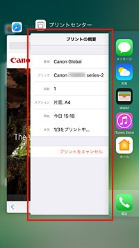 iOS機器の[ホーム]ボタンを2回押してマルチタスクモードにし、右にスワイプして表示される[プリントセンター]をタップしてください。