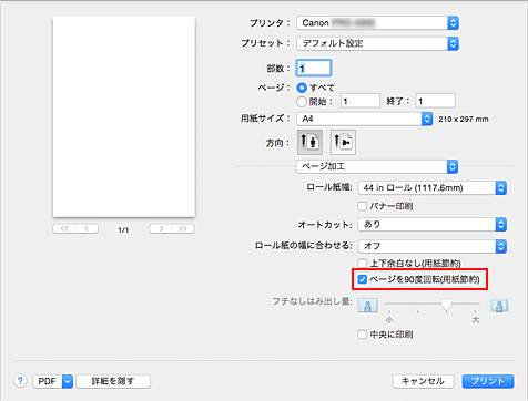 • プリントダイアログの[用紙サイズ]で縦長の用紙を選んでいるとき、縦方向の長さが[ロール紙幅]で選んでいる幅よりも長い場合は、[ページを90度回転(用紙節約)]は使用できません。