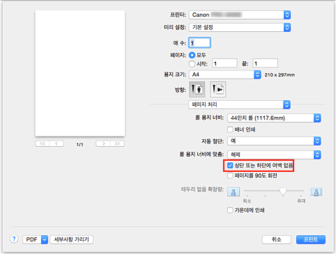 롤 용지에 인쇄하는 경우 상단 및 하단 여백을 제거하여 용지를 절약할 수 있습니다.