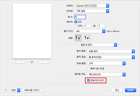 - PDF에서 Canon imagePROGRAF Preview를 선택한 경우에도 인쇄 결과를 표시할 수 있습니다.