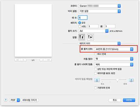 용지 공급(Paper Source)에서 롤 용지를 선택한 경우 롤 용지 너비(Roll Paper Width)를 프린터에 로드된 롤 용지의 너비로 설정합니다.