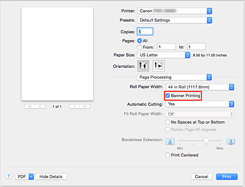 - Cuando se selecciona "XXX (sin bordes)" o "XXX (Hoja cortada)" para Tamaño de papel (Paper Size) en el cuadro de diálogo de impresión, Imprimir título (Banner Printing) se muestra atenuado y no se puede establecer.