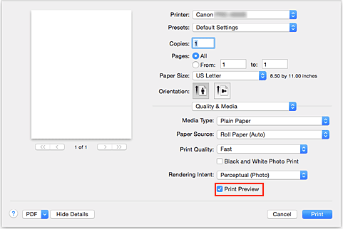 Al ejecutar la impresión, configure Canon imagePROGRAF Preview para mostrar los resultados de impresión.