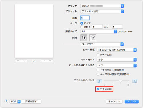 • プリントダイアログの[用紙サイズ]で「XXX (フチなし)」を選んでいる場合、[中央に印刷]はグレー表示となり設定できません。