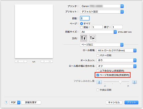 - プリントダイアログの[用紙サイズ]で縦長の用紙を選んでいるとき、縦方向の長さが[ロール紙幅]で選んでいる幅よりも長い場合は、[ページを90度回転(用紙節約)]は使用できません。