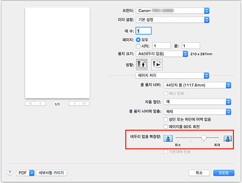 중요- 테두리 없음 확장량(Borderless Extension) 슬라이더 막대를 오른쪽 끝 위치에 설정하면 용지 뒷면이 얼룩질 수 있습니다.