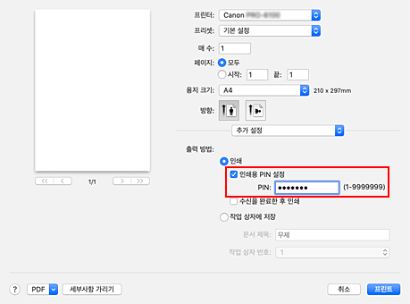 인쇄용 PIN 설정(Set PIN for printing) 옆의 확인란을 선택하고 PIN에 1~7자리 숫자를 입력합니다.