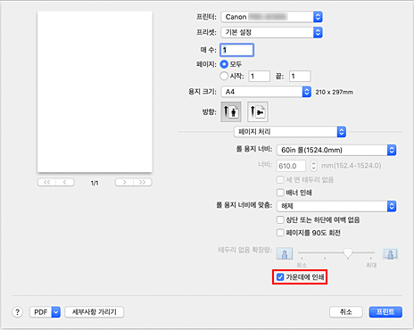 - 프린트 대화 상자에 있는 용지 크기(Paper Size)에서 "XXX 테두리 없음"을 선택하면 가운데에 인쇄(Print Centered)는 회색으로 표시되고 선택할 수 없습니다.