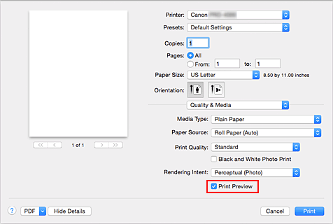 Al ejecutar la impresión, configure Canon imagePROGRAF Preview para mostrar los resultados de impresión.