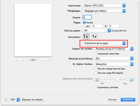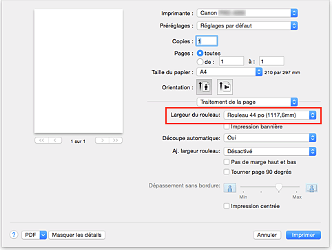 Si vous sélectionnez un papier rouleau dans Alimentation papier, renseignez la largeur du papier rouleau chargé dans l'imprimante sous Largeur du rouleau.