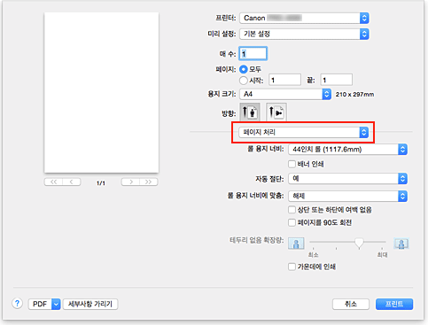 용지 크기(Paper Size)에서 사용할 용지 크기를 선택합니다.