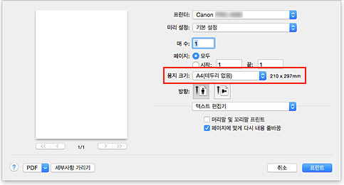 프린터 대화 상자의 용지 크기(Paper Size)에서 "XXX (테두리 없음)"을 선택합니다.