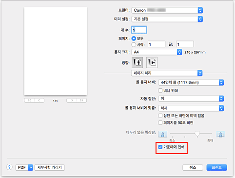 가운데에 인쇄(Print Centered) 확인란을 선택합니다.