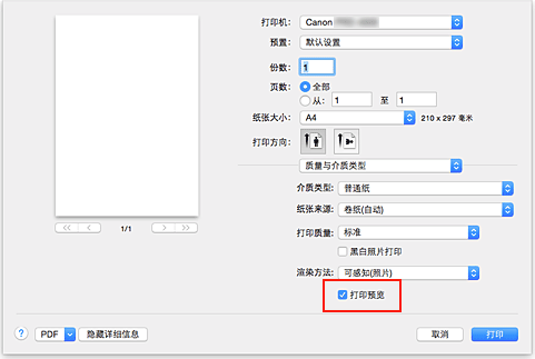 执行打印时,启动Canon imagePROGRAF Preview以显示打印效果。