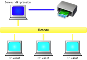 Lorsque plusieurs ordinateurs sont utilisés dans un environnement réseau, vous pouvez partager l'imprimante connectée à l'un des ordinateurs avec les autres.