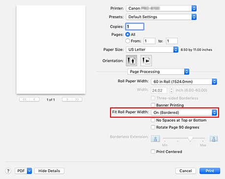 5. Auswählen von Ein (mit Rand) (On (Bordered)) oder Ein (randlos) (On (Borderless)) zur Anp.an Rollenp.-Br. (Fit Roll Paper Width)