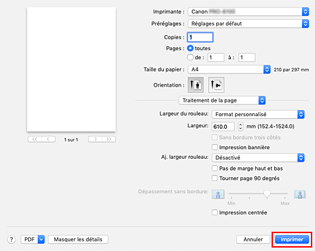 Si vous effectuez l'impression, le papier rouleau avec la largeur spécifiée sera utilisé pour l'impression.