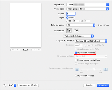 - Lorsque le paramètre « XXX sans bordure » ou « XXX feuille de découpe » est sélectionné pour Format papier (Paper Size) dans la boîte de dialogue Imprimer, l'option Impression bannière est grisée et ne peut pas être sélectionnée.