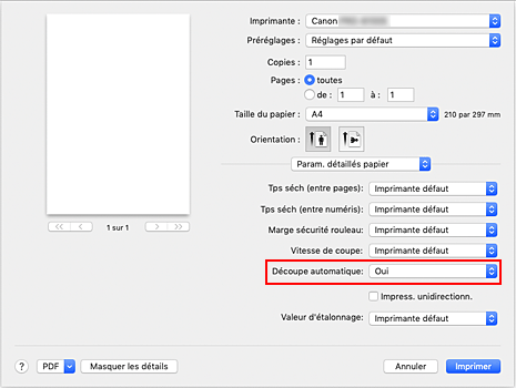 Pour couper le rouleau automatiquement et imprimer les marques de coupe, procédez comme suit :