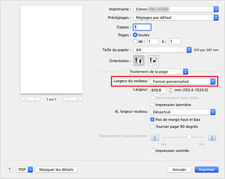 Sélectionnez Format personnalisé pour Largeur du rouleau.