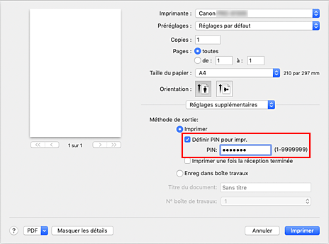 Si vous saisissez le code PIN que vous avez défini sur le panneau de contrôle de l'imprimante, la tâche d'impression sera imprimée.