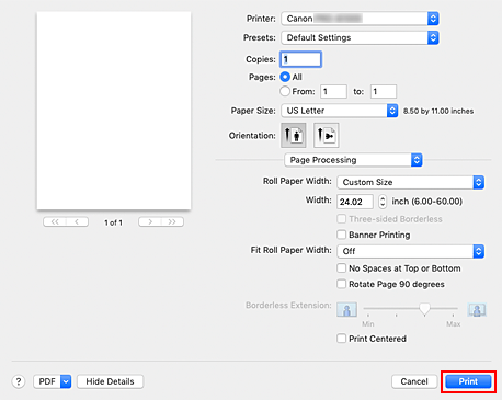 Selezionare Carta in rotoli (Auto) (Roll Paper (Auto)), Rotolo 1 (Roll 1) o Rotolo 2 (Roll 2) in base alle proprie esigenze di Alimentazione carta (Paper Source).