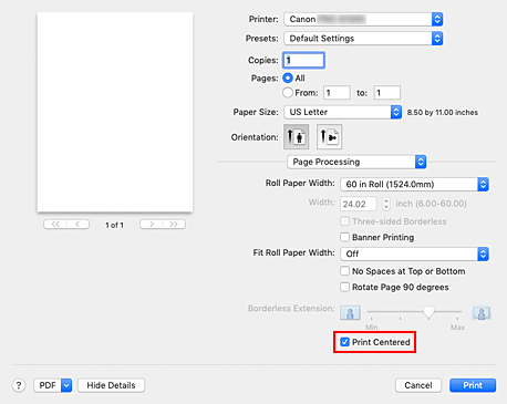 Quando você quiser posicionar o documento original no meio do papel cortado e imprimir, ou então imprimir com margens iguais na direita e na esquerda com relação ao comprimento do papel em rolo, use a função Imprimir centralizado (Print Centered).