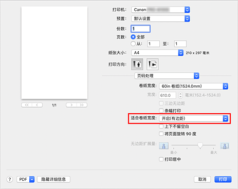 将开启(无边距)选择为适合卷纸宽度或开启(有边距)。