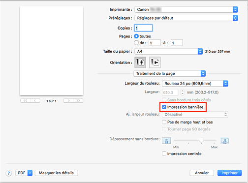 - Lorsque le paramètre « XXX sans bordure » ou « XXX feuille de découpe » est sélectionné pour Taille du papier dans la boîte de dialogue Imprimer, l'option Impression bannière est grisée et ne peut pas être sélectionnée.