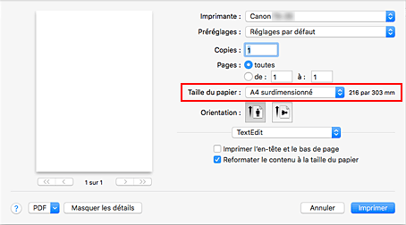 Dans la boîte de dialogue Imprimer, sélectionnez « XXX surdimensionné » pour Taille du papier.