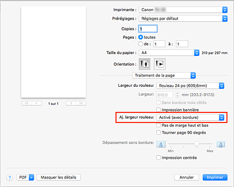 Pour Aj. largeur rouleau, sélectionnez Activé (avec bordure) ou Activé (sans bordure).
