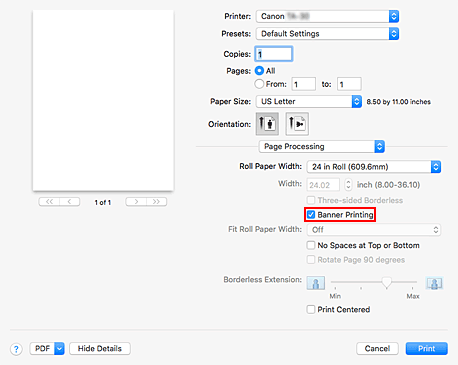 - Se è selezionata l'opzione "Senza bordo XXX" o "Foglio singolo XXX"per Formato carta (Paper Size) nella finestra di dialogo Stampa, l'opzione Stampa intestazione (Banner Printing) è inattiva e non può essere impostata.