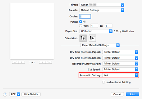 In Taglio automatico (Automatic Cutting), selezionare l'impostazione in base alle proprie esigenze.