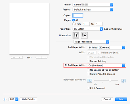 Selezionare Attivato (con bordo) (On (Bordered)) o Attivato (senza bordo) (On (Borderless)) per Ad.a larg.carta rot. (Fit Roll Paper Width)