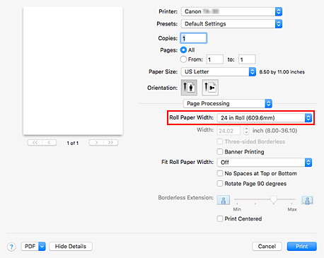 Selezionare Carta in rotoli (Roll Paper) per Alimentazione carta (Paper Source).