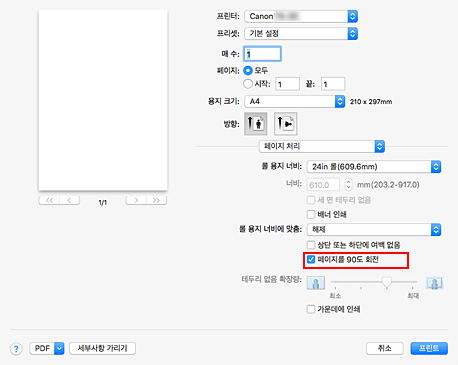 • 프린트 대화 상자의 용지 크기(Paper Size)에서 세로형 용지를 선택한 경우 그 길이가 롤 용지 너비(Roll Paper Width)에서 선택한 너비를 초과하면 페이지를 90도 회전(Rotate Page 90 degrees)을 사용할 수 없습니다.