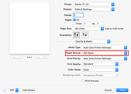 Выберите значение Рулон бумаги (Roll Paper) для параметра Источник бумаги (Paper Source).