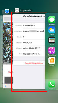 Cliquez deux fois sur le bouton Accueil du périphérique iOS pour passer en mode multitâche, balayez vers la droite pour afficher le centre d'impression, puis touchez celui-ci. Dans l'écran qui s'affiche, touchez sur la tâche d'impression à supprimer, puis touchez Annuler l'impression.